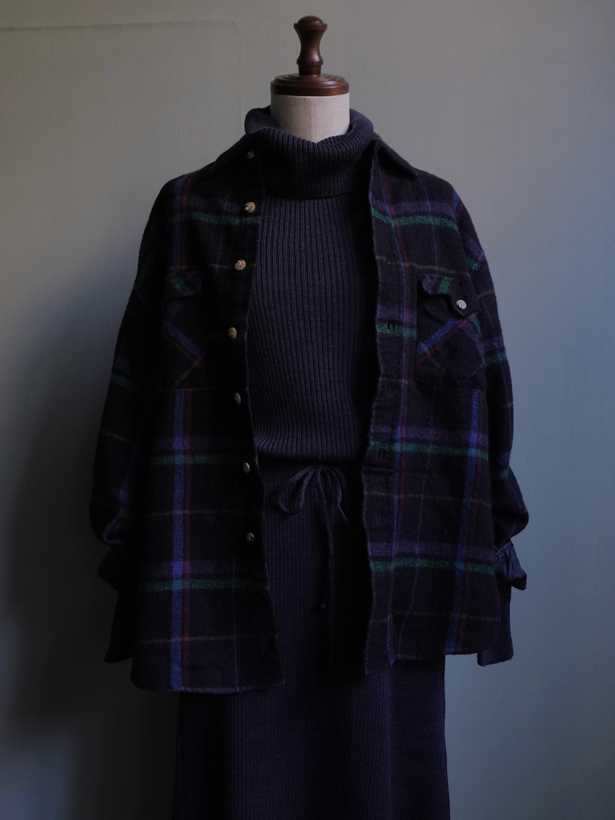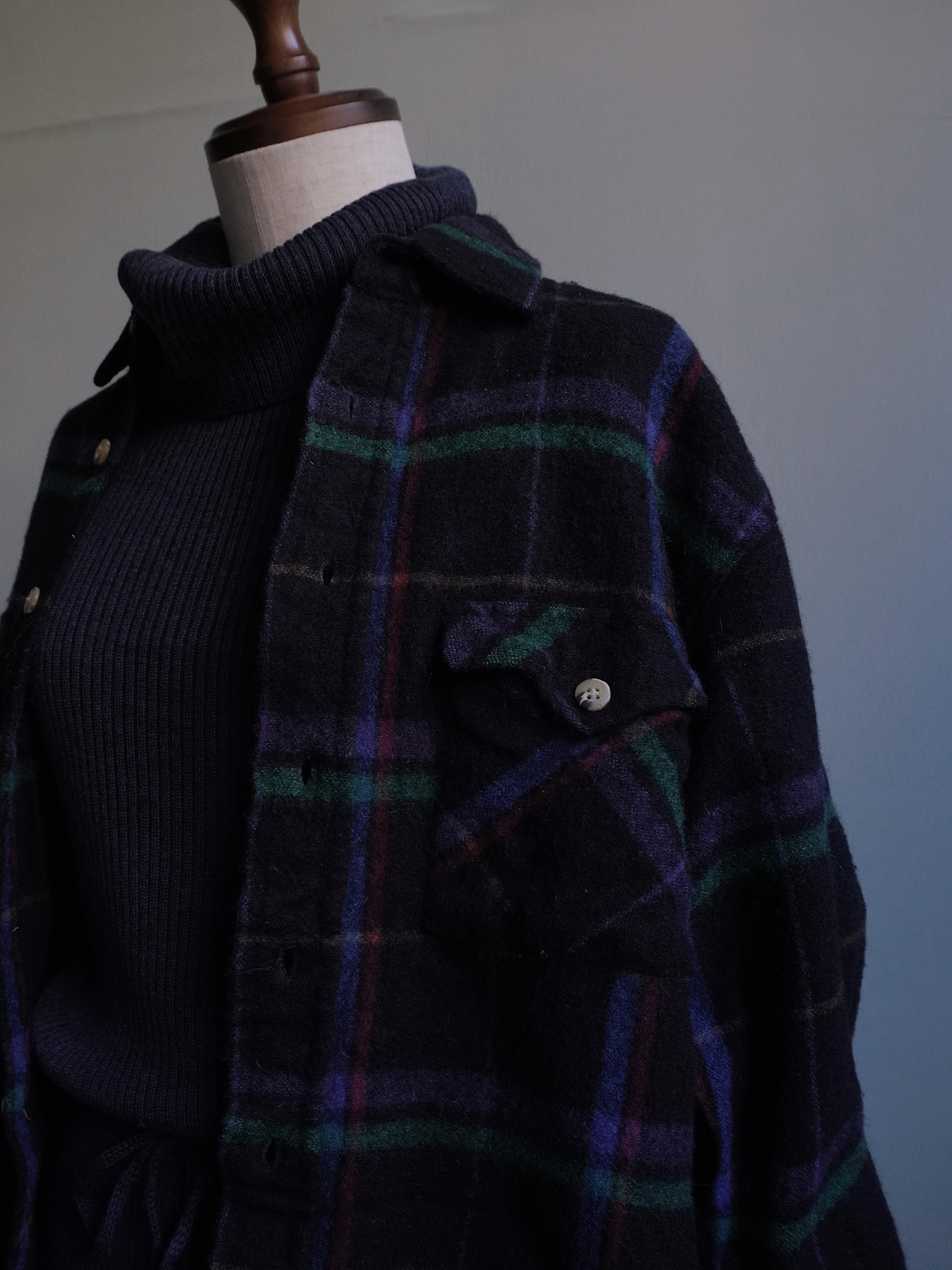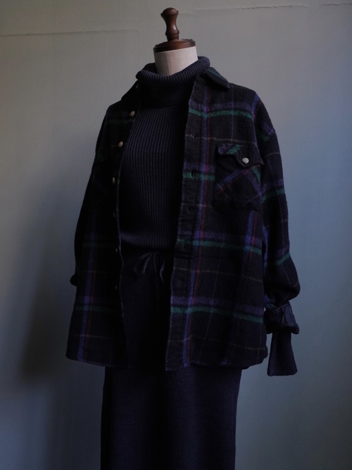 ほんのり紫がかったブラックベースのウールシャツ